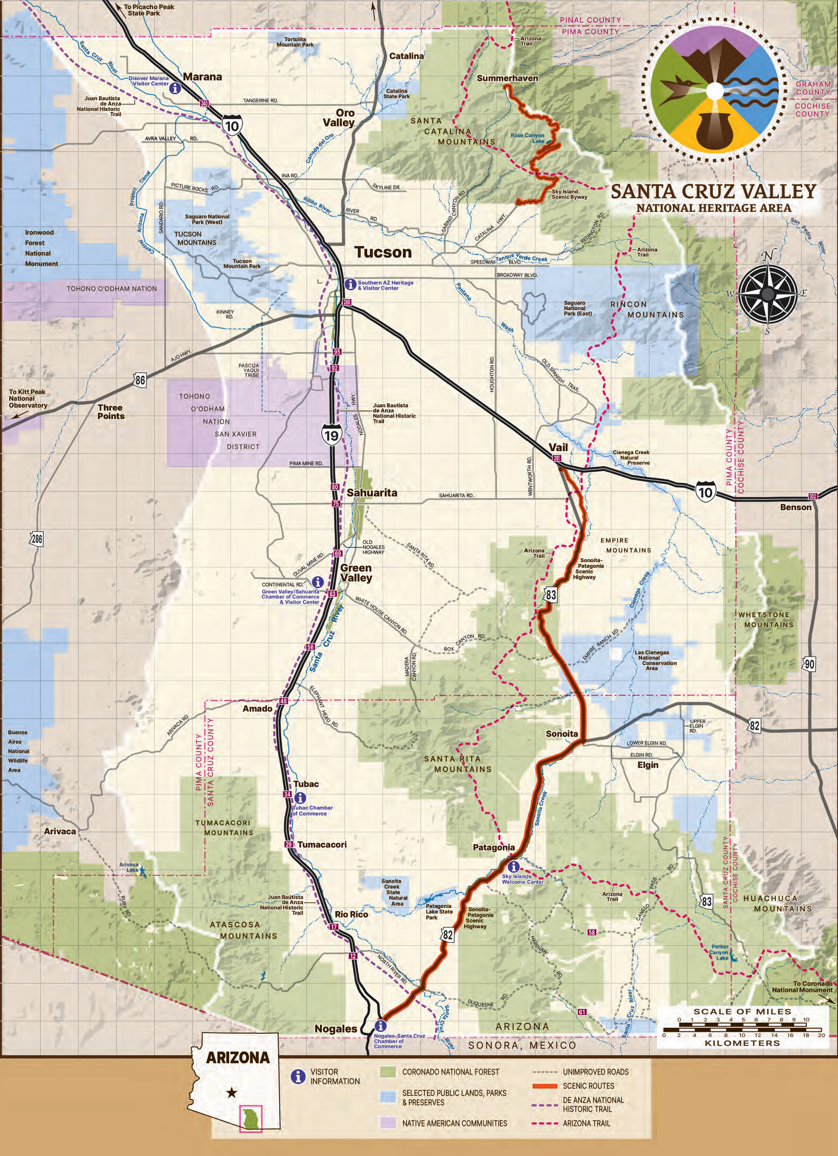 Situated along an ancient and currently vital trade route, the Santa Cruz Valley National Heritage Area (SCVNHA) honors and celebrates the natural environment, cultural traditions, historic places, and working landscapes of the watershed of the Santa Cruz River which comprises 3,300 square miles in Pima and Santa Cruz counties in southeastern Arizona.