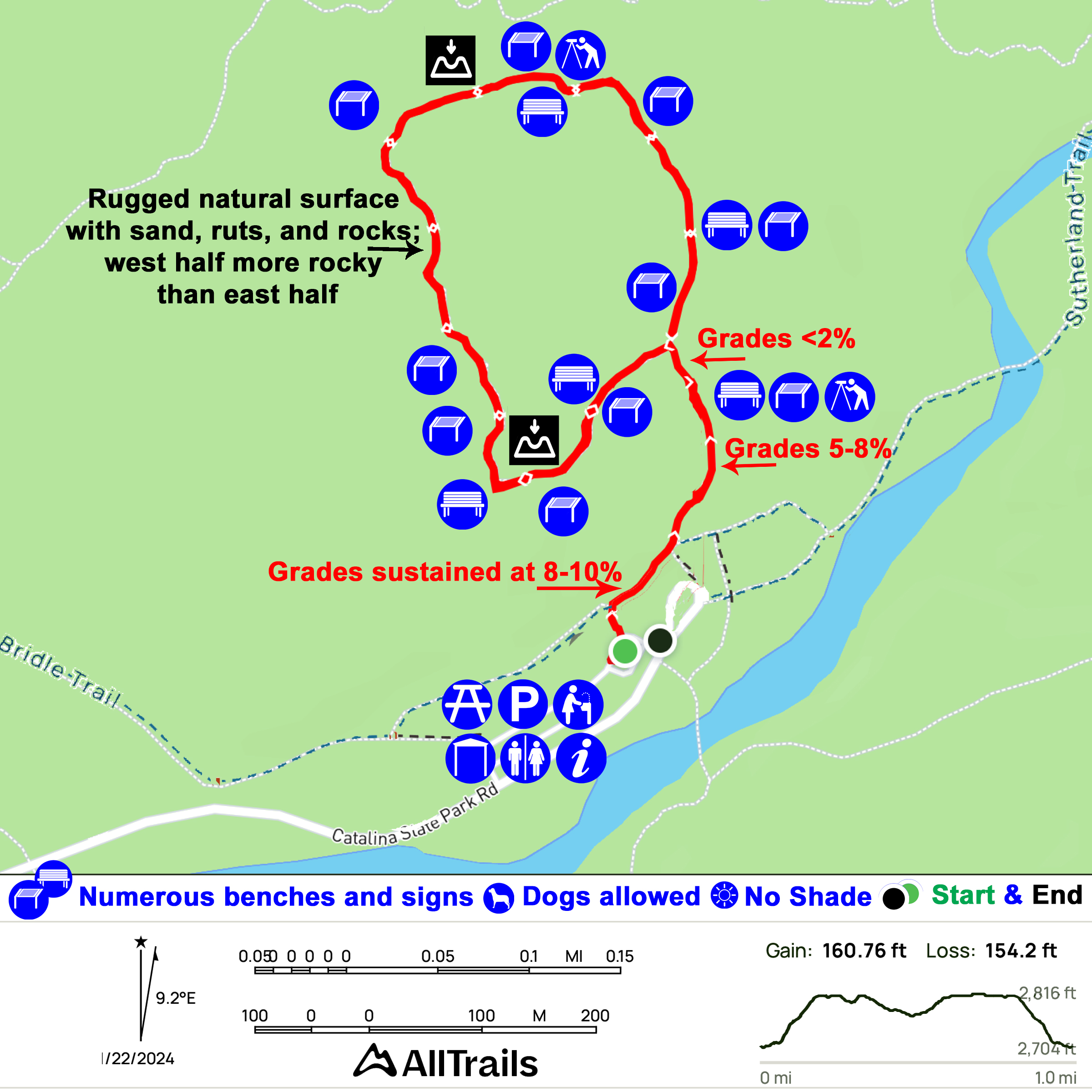 Trail length plus more: 1.0 miles, Gain 160’, Elevation 2800’, Grades >8° in first 0.2 miles