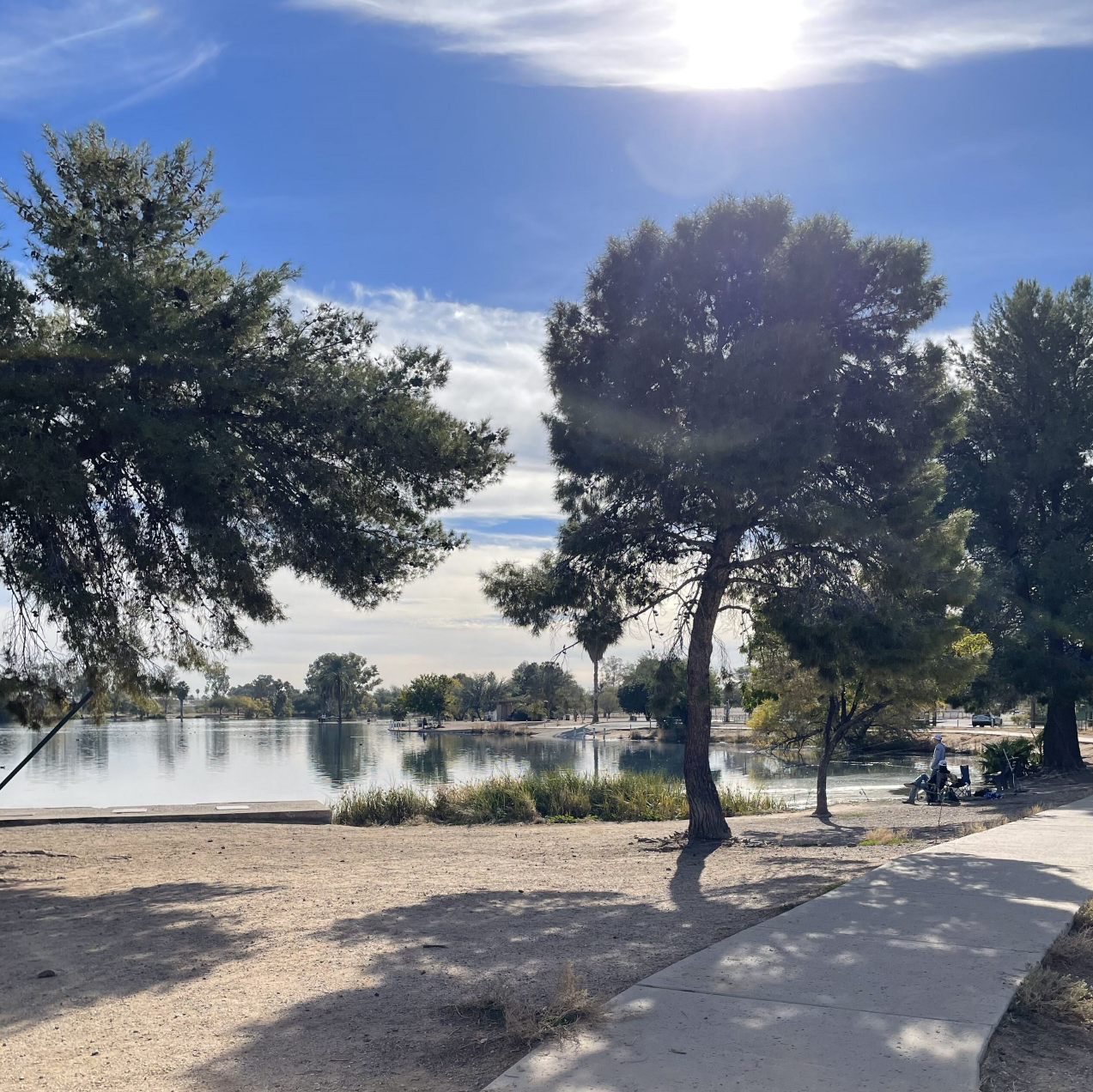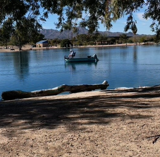 The park entrance is marked with a large sign along the Santa Cruz riverbed, easily visible from Silverbell Road. After driving into the park, the leftmost driveway leads to the main parking lot, which includes restrooms, drinking fountains, and information signs. This is also the location of the primary boat launch. The parking lot and many picnic tables are shaded with large arrays of solar panels.