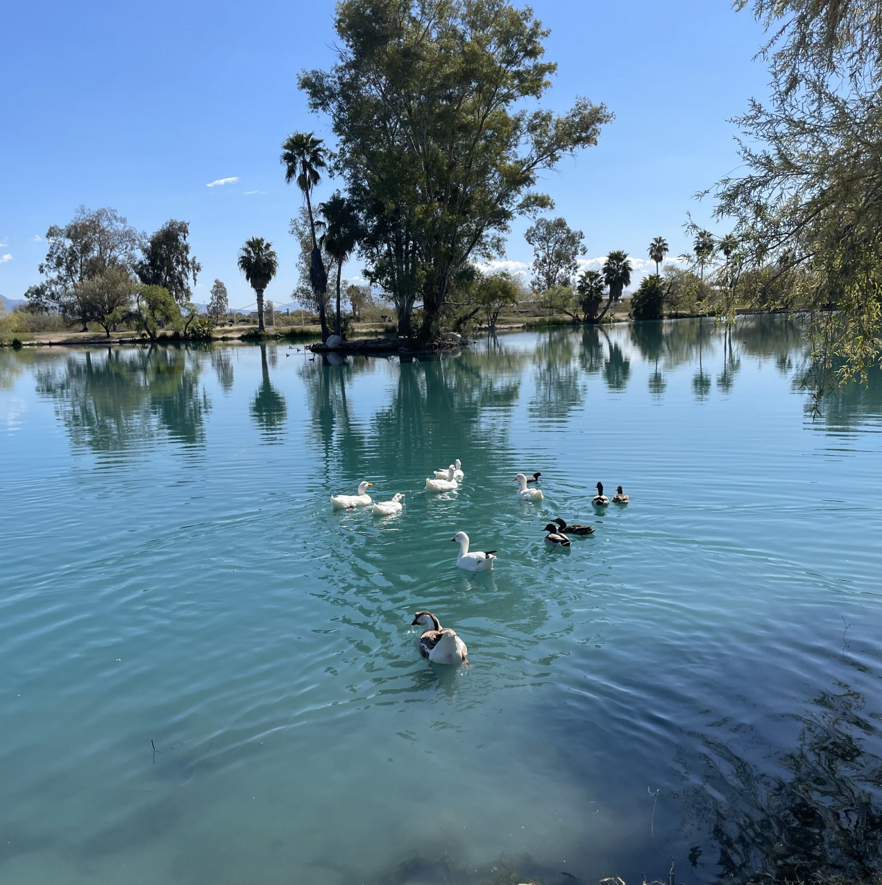 Hikers can take a gentle stroll along the lake with up-close views of waterfowl and long-distance views of mountains in all directions. Park flora offers a wide variety, ranging from native desert habitat to aquatic plants such as rushes and willows.  At one point, the park trail links with Tucson’s Chuck Huckleberry Loop, which is a popular cycling path along the Santa Cruz River.