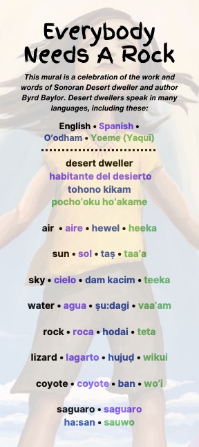To connect Pagac’s and Baylor’s two forms of storytelling—visual and written—we created this supplementary handout which translates objects and ideas depicted in the mural from English and Spanish into the first languages of this region, O’odham and Yoeme, languages at risk of being lost altogether.