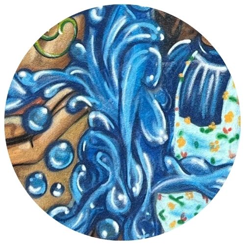 Arizona is an epicenter of culture and living traditions. These cross-border connections are illustrated through the two young girls. “Las Primas” is named for the two cousins depicted, one taking on a darker complexion that mirrors Mexican ties versus her fairer-skinned cousin on the opposite side of the border. This speaks to not only the familial ties that reach across the border but also the many connections and traditions that are shared despite the separation from the border. The two girls are modeled after the artist’s daughter and niece.