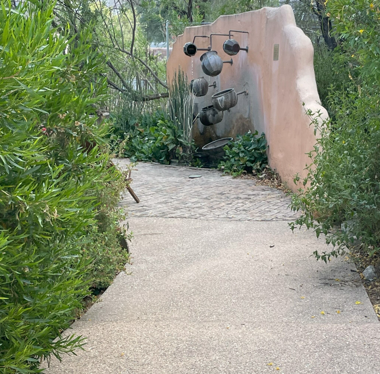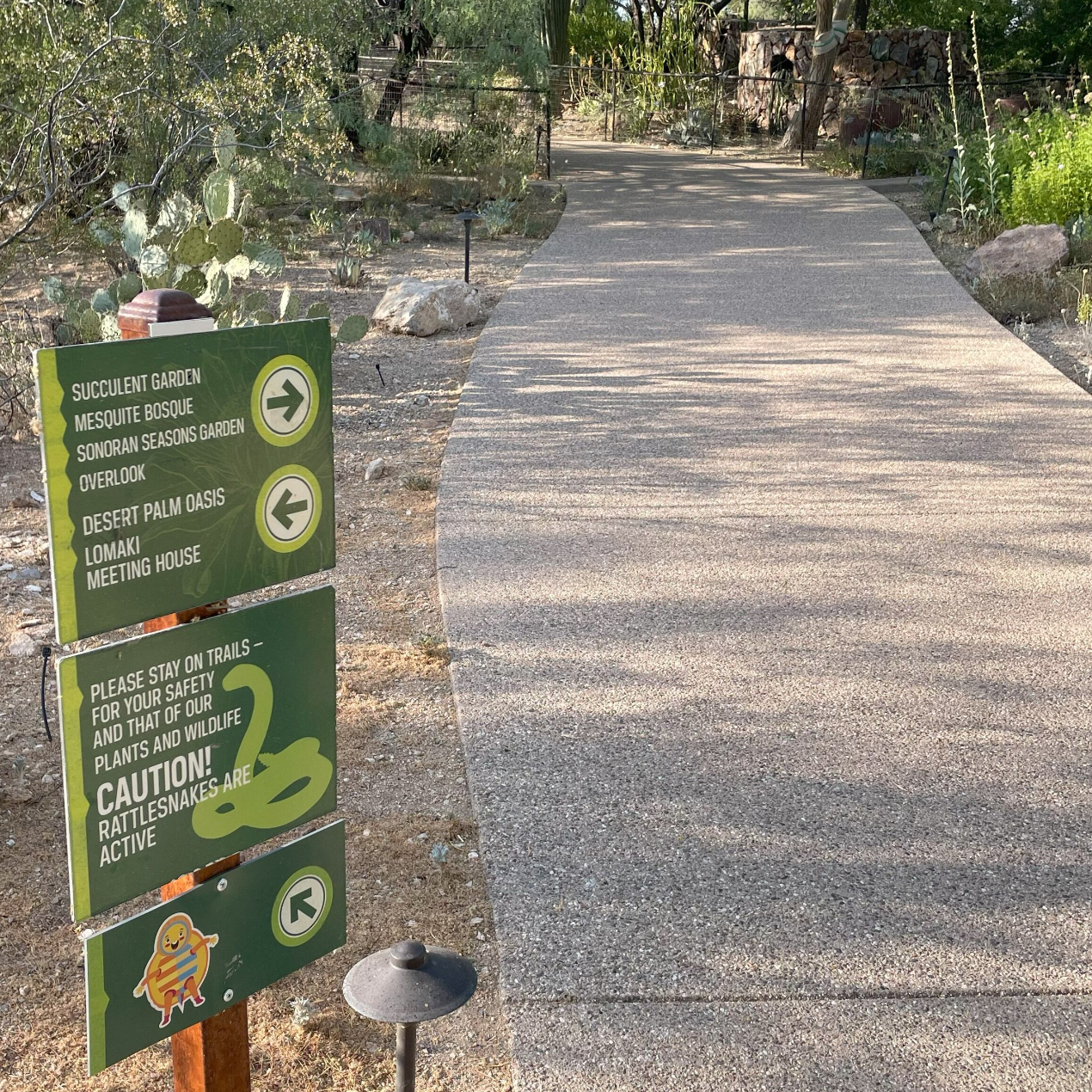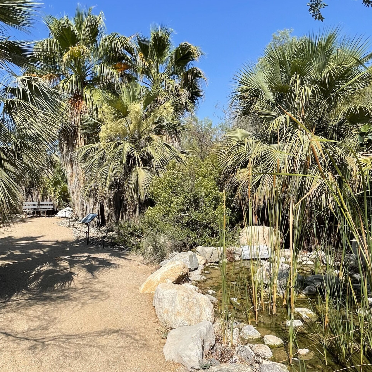 Dozens of paved and packed-earth trails lead visitors past saguaros, succulents, streams, and sculptures. Along these trails, hikers pass through themed gardens designed to feature local geology, climate, flora, and horticulture. The Streamside Garden and Desert Palm Oasis provide cool stops on a hot sunny day. The Desert View Trail loops for a half mile into the native environment with the convenience of benches, ramadas, and a water station. It is not uncommon to share the Park trails with roadrunners, quail, and hummingbirds, as well as lizards and a tortoise or two.