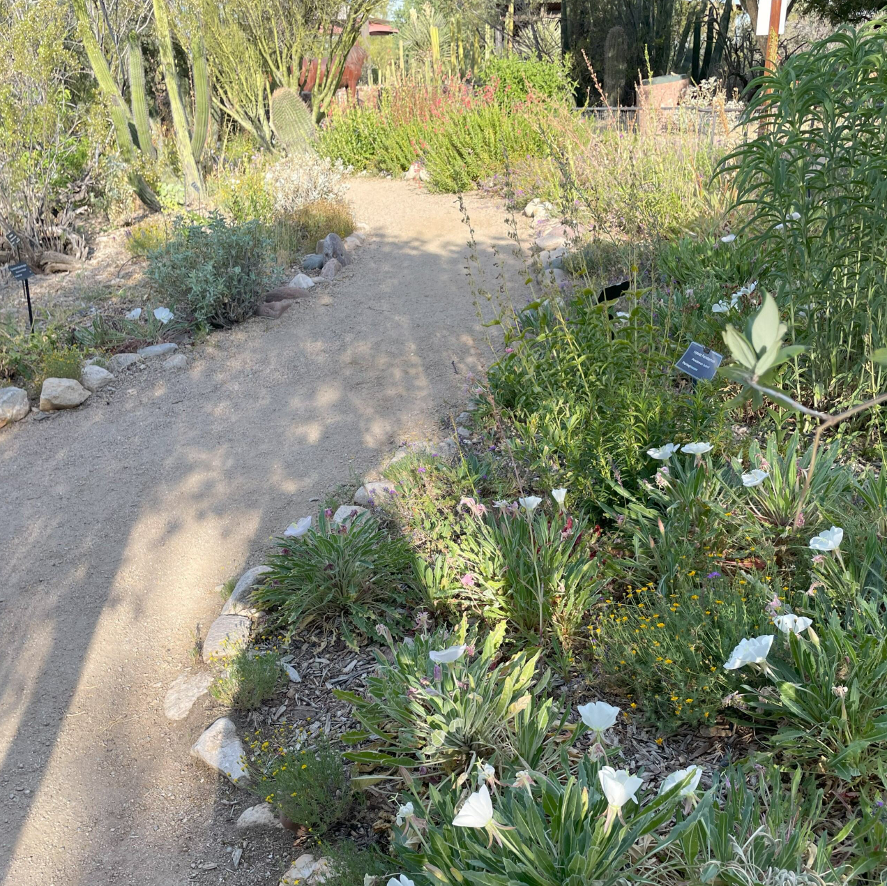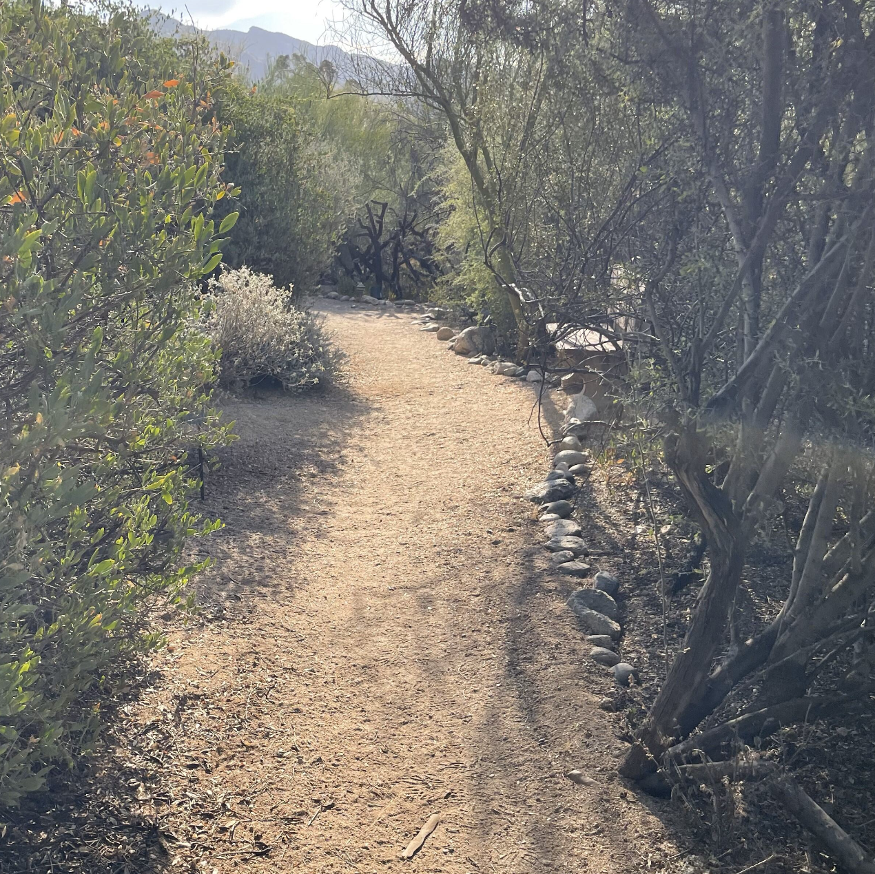 Tohono Chul Park is in north-central Tucson on a small, well-marked side street near the popular Casas Adobes Plaza. Street signs direct drivers to the entrance where there is ample accessible parking and a pedestrian path to admissions, restrooms, a gift shop, and a café. The hike begins on a paved walkway that branches into multiple dirt paths leading to points of interest.