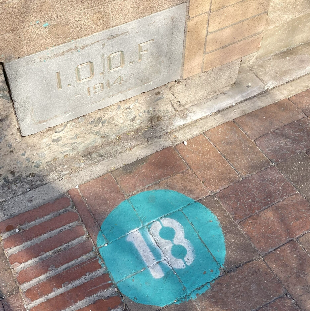 Follow the trail numbers painted on the sidewalk for notable sites, like this one marking The Odd Fellows Club.