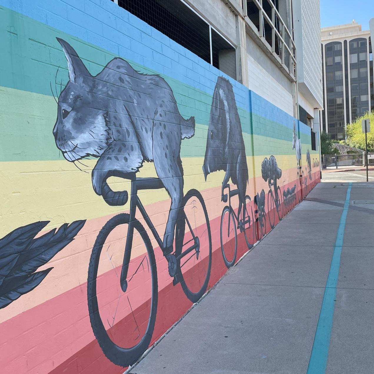 Though the Turquoise Trail is designed to tell the story of Tucson’s history, it is also ideal for viewing Tucson’s contemporary murals and sculptures. For example, on the way to the Presidio Museum, the Trail passes the iconic El Tour de Tucson mural. Near the historic railroad depot is a multi-story mural of La Mujer Empoderada (the empowered woman). The beautiful Saint Augustine Cathedral, dating to the 1800s, was recently updated with a steel band shell made of 300 giant flowers, 1000 leaves, and dozens of butterflies and birds. And the Rialto Theatre – built in the 1920s – has a wall-sized mural that honors the musician Prince, who died nearly 100 years later.